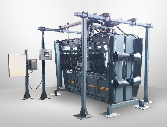 Гидравлическим механизмом управления: открытия/закрытия стен станка, шейных ворот, откидных бортов и держателя головы;